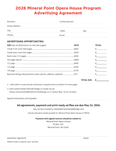 Thank you for your support of the Mineral Point Opera House. If you have questions about advertising opportunities, please call 608.987.3501 or email info@mineralpointoperahouse.org.