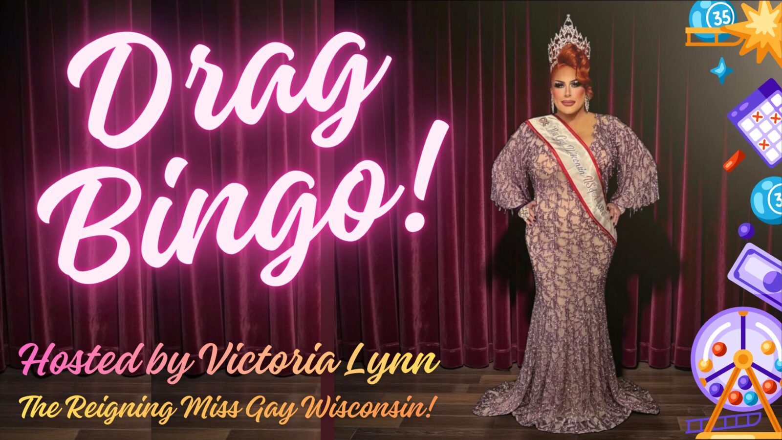 Join us for an unforgettable evening hosted by the current Miss Gay Wisconsin 2026, Victoria Lynn, who’ll be calling numbers with more drama, wit, and rhinestones than you ever thought possible. Victoria Lynn has been a Drag Entertainer for the past 8 years. She is known for being Large and In Charge. She is a pageant queen at heart and has captured many titles and even competed nationally with plans to continue that trajectory. Victoria loves to be pretty in pink, and buck the house down boots making sure to show the skinny girls that a big b*tch can be stunning too! Find Victoria performing all throughout the Midwest and beyond wherever an opportunity arises!